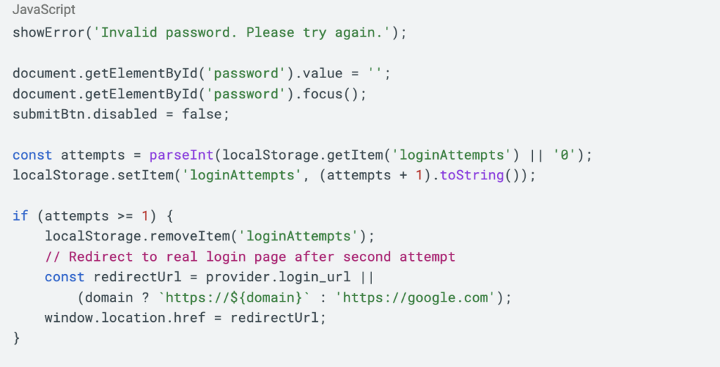 After the second attempt, the page resets the local counter ‘loginAttempts’ and redirects the victim to the legitimate website. This helps conceal the attack, as the victim may assume that the login simply failed and that they were redirected back to the normal website.