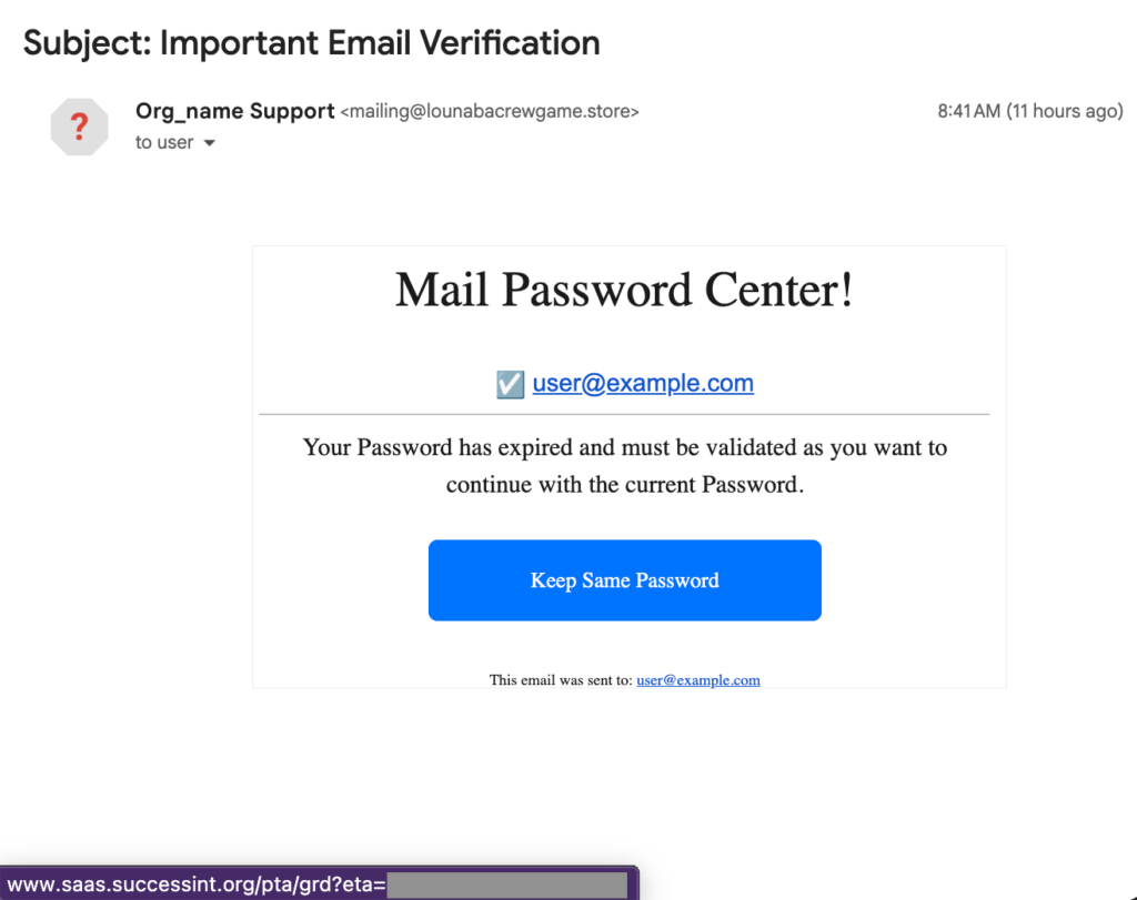 We have received a phishing message for analysis. The message follows a common social engineering pattern – it warns the recipient that their password is about to expire and urges them to change it via a link. While the email itself appears relatively typical, the phishing infrastructure behind the link reveals a scalable credential harvesting mechanism.
